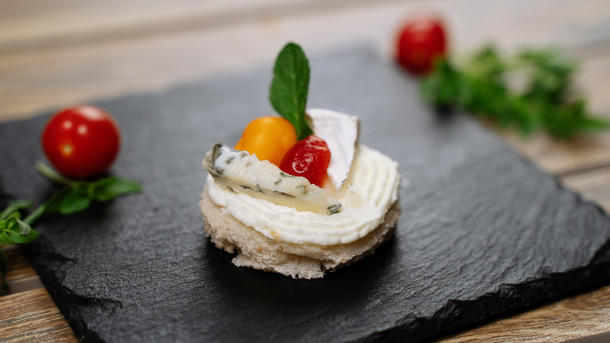 Брускетта с сырным трио - камамбер, горгогзола и маскарпоне - и сезонной ягодой